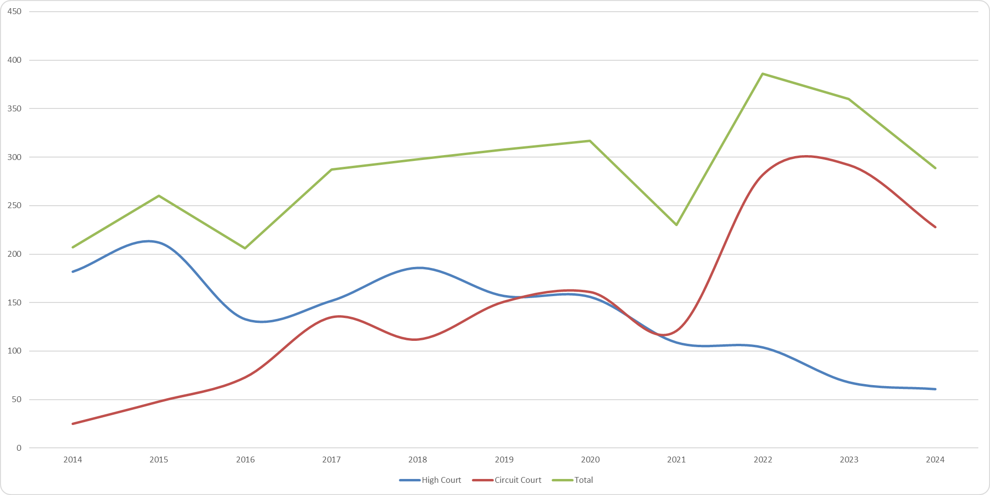 - The High Court decline has been offset by dramatic growth in the Circuit Court, with claims jumping from just 25 in 2014 to 228 in 2024, an 812% increase.