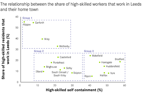 Figure 3: Some places are more reliant on Leeds for high-skilled jobs than others