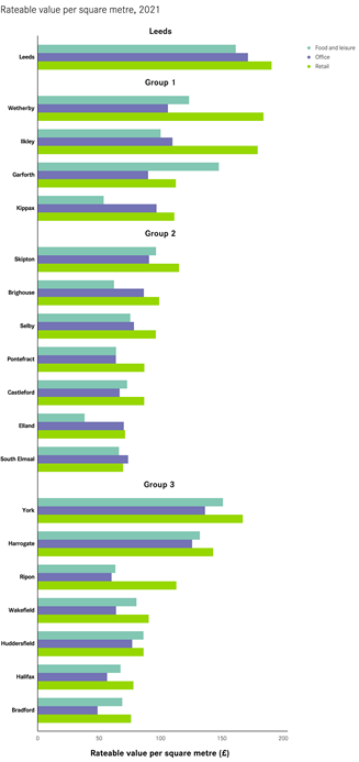 Reflecting this, the rents (proxied by rateable values) vary across these places. For retail in particular, the Group 1 towns of Wetherby and Ilkley have some of the highest values (close to those in Leeds city centre). Group 2 towns such as Elland and South Elmsall/South Kirby tend to have the lowest rents. And Group 3 show a mix, with Harrogate having high rents but Halifax having lower rents. In terms of offices, Harrogate town centre has the highest rents of any of the town centres in Group 3. This is reflective of the town’s stronger, more independent economy where office space is in demand.