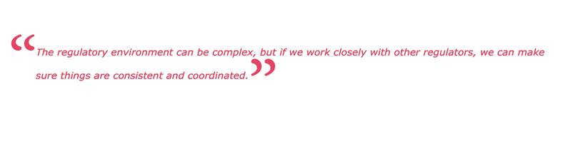 “The regulatory environment can be complex, but if we work closely with other regulators, we can make sure things are consistent and coordinated,” says Baker. “It’s really important that we are speaking with a common voice.”