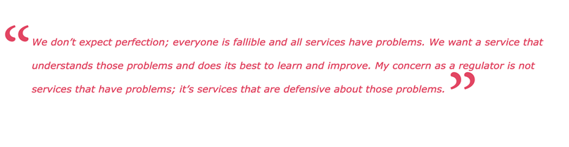 “This typifies the culture of learning we want to create. A culture that doesn’t see things going wrong as a failure, but as an opportunity to learn. This is tricky for healthcare, but we don’t want a culture of defensiveness when things go wrong, we want honesty, transparency and learning,” says Baker. “We don’t expect perfection; everyone is fallible and all services have problems. We want a service that understands those problems and does its best to learn and improve. My concern as a regulator is not services that have problems; it’s services that are defensive about those problems.”